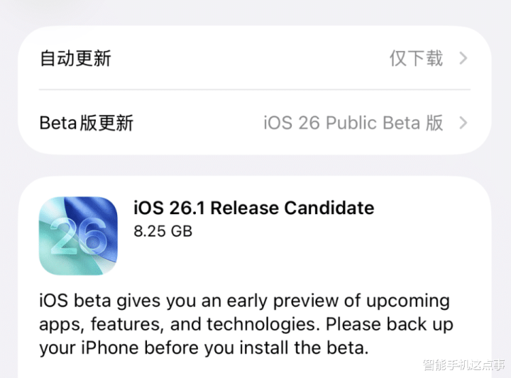 据了解,苹果向开发者频道推送了iOS 26.1 RC版,版本号23B82。